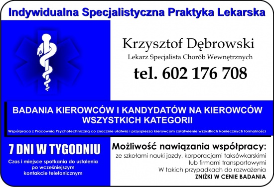 Przeprowadzam badania lekarskie kierowców i kandydatów na kierowców wszystkich kategorii od ponad 12 lat i posiadam spore doświadczenie w tej dziedzinie. W razie potrzeby istnieje możliwość spotkania w dni świąteczne i wolne od pracy, również wieczorem. Każda wizyta czy spotkanie po wcześniejszym kontakcie telefonicznym. Współpracuję już z kilkoma szkołami nauki jazdy czy korporacjami taksówkarskimi. Z opinii, które do mnie docierają, wszyscy są zadowoleni. U mnie oszczędzisz przede wszystkim czas, niepotrzebną stratę pieniędzy na robienie zbędnych badań i oczywiście masz możliwość spotkania w godzinach popołudniowych oraz dni wolne. Serdecznie zapraszam i zachęcam. Koszt badania uzależniony od posiadanej kategorii prawa jazdy. Tel. 602 176 708.