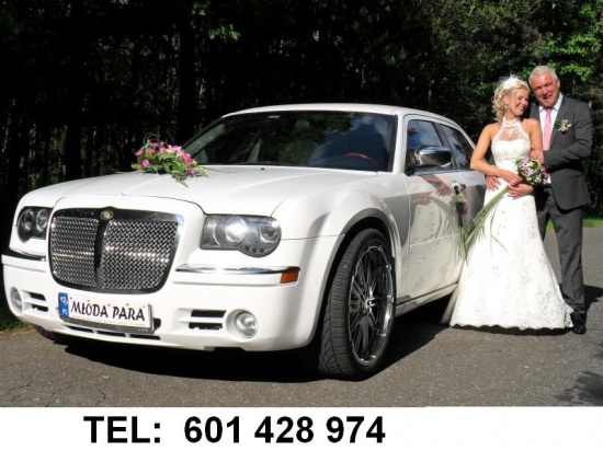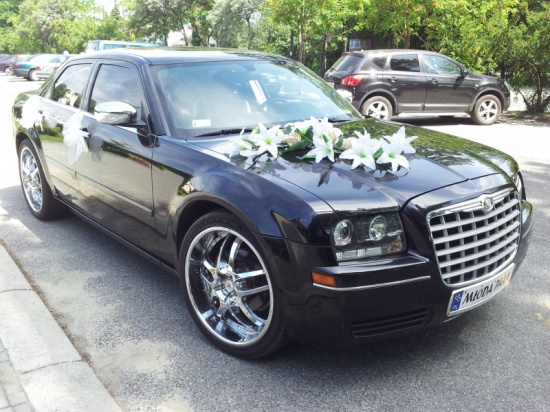 Oferujemy Państwu wynajem dwóch luksusowych limuzyn do slubu marki Chrysler 300c w kolorze; czarnym oraz białym (nie jest to kość słoniowa ani kremowy, ecri) na 22calowych chromowanych felgach
