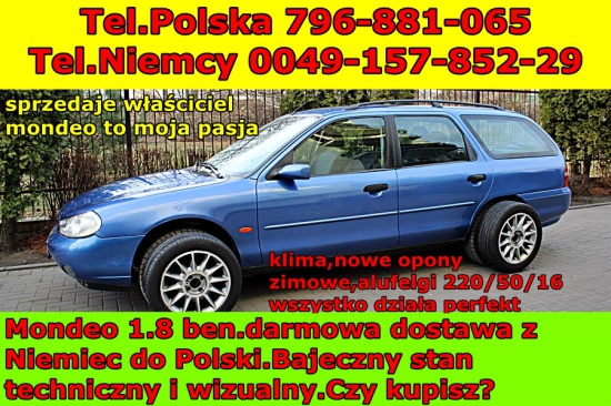 Sprzedam prywatnie moje auto, 4500 złotych ,do małej korekcji..Czy kupisz to super auto w bajecznym stanie technicznym?Auto jest rzeczywiście jak nowe. Tel. Polska 796 - 881 - 065 ...Tel. Niemcy 0049-1578 - 529 - 5230 link do 250 fotografii auta(kliknij) https://plus.google.com/u/0/photos/101910929967555115909/albums/6244888004469500225 DARMOWA DOSTAWA AUTA Z NIEMIEC DO POLSKI-oszczędzicie Państwo na tym 2000 złotych..Nie poniesiecie kosztów transportu ,numerów,ubezpieczeń ,benzyny ,wyjazdu ,poszukiwań. AUTO jest po generalnym przeglądzie technicznym .Mondeo użytkowane było tylko przez jednego właściciela , który wyjątkowo zadbał o swoje auto.( jestem wielbicielem tej marki ,Mondeo to moja wielka pasja ) . Jeżeli macie Państwo jakieś propozycje, bądź pytania lub wątpliwości ,chętnie udzielę wszelkich informacji ,proszę tylko zadzwonić ,na pewno się dogadamy. Auto nie wymaga najmniejszego wkładu finansowego i jest w 100% bez wypadkowe,lakier bez uszkodzeń ,porysowań ,rdzy. Motor 1800 cm benzyna 115 koni, jest to nie zawodna bezawaryjna jednostka napędowa , auto ma wspaniałe przyspieszenie. Ten samochód nie ma żadnych wad,usterek,ani żadnej rzeczy która była by nie sprawna . Polecam ten piękny samochód dla osób,które wymagają od swego auta wysokiego komfortu podróżowania,a jednocześnie potrzebują auta funkcjonalnego i niezawodnego. Zachęcam do kupna ,bo w takim bajecznym stanie używany samochód to naprawdę wielka rzadkość. Serdecznie zapraszam na oględziny i jazdę próbną. U mnie opis tego autka zgadza się ze stanem faktycznym w sto procentach. AUTO POSIADA ładne aluminiowe felgi opony MS na 205/50/R 16 plus drugi komplet nowych zimowych kół 195/60/R15, KLIMATYZACJA działa super. Radio CD, zmieniarka płyt CD Siedzenia w kolorze auta-jak nowe. relingi.hak. roleta bagażnika 4 (poduszki ) Radio CD regulacja elektryczna fotela kierowcy skórzana kierownica wspomaganie kierownicy sterowanie szyb elektrycznie x2 podgrzewane lusterka lusterka sterowane elektrycznie .regulacja reflektorów a.b.s e.s.p a.s.r halogeny centralny zamek na pilota,otwieranie bagażnika pilotem. poduszki powietrzne x 4 auto alarm wspomaganie kierownicy regulowany elektrycznie fotel kierowcy podgrzewane lusterka podgrzewana zadnia szyb dodatkowe światło STOP fabryczny autoalarm immobilizer regulowana kierownica hamulce tarczowe wentylowane,nowe klocki wszystkie szyby oryginalne z 2000 roku Ważne ubezpieczenie OC elektryczny regulator świateł niebieski błękitny metalik( piękny lakier ) Cena.. 4500 złotych,do małej korekcji ? Nie zwlekaj,koniecznie szybko zadzwoń....naprawdę warto używane,auto w takim super stanie to wielka rzadkość w prezencie kupujący otrzyma ubezpieczenie OC na jeden miesiąc za darmo......Auto od zaraz gotowe do jazdy---można nim wracać do domu bez dodatkowych formalności i opłat.? UWAGA LINK DO 250 super fotografii tego auta KLIKNIJ,. https://plus.google.com/u/0/photos/+adamFord-Hamburg/albums/6244888004469500225?