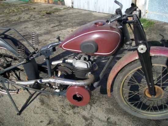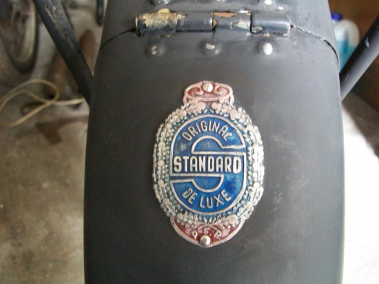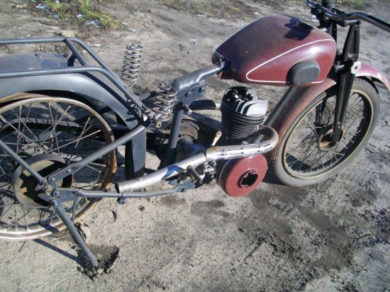 Sprzedam przedwojenny zabytkowy motocykl, prawdopodobnie standard de luxe z ok. 1930 roku. Silnik "Bark" ma ładną kompresję. Posiada nie widoczne na zdjęciach tzw. sercowe siedzenie kierowcy Drilastic na sprężynach oraz lampę przednią i dekle ze szczękami na każdym z kół. Gratis siedzenie pasażera.