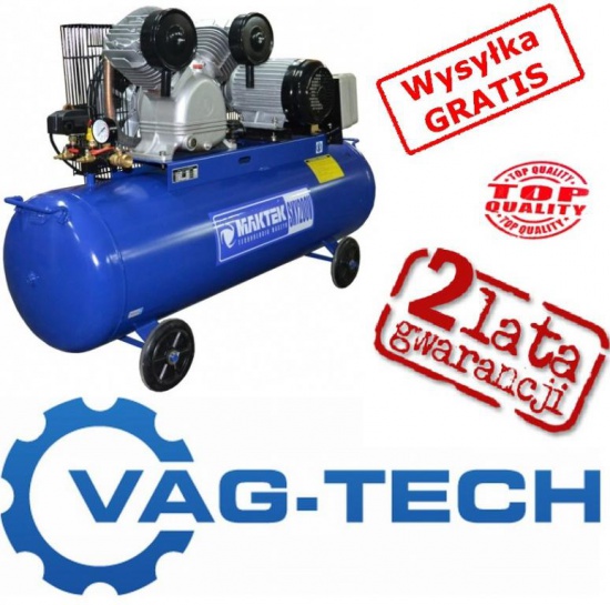 Sprężarka posiada zbiornik o pojemności 200 litrów, wykonany z blachy o grubości 4 mm cynkowanej dwustronnie. Maksymalne ciśnienie wytwarzane w butli to 10 barów. Silnik elektryczny napędzający sprężarkę charakteryzuje się mocą 4000W – 5,5 KM. Duża moc i zasilanie trzy fazowe , przełożenie napędu przez pasek daje duży moment obrotowy zapewniając w ten sposób płynne i bezproblemowe działanie agregatu. Konstrukcja z 2 tłokami chłodzonymi olejem w układzie widlastym zapewnia stabilność oraz długą żywotność urządzenia. Układ tłoków zapewnia również doskonałe oddawanie ciepła, co jest niezbędne przy profesjonalnym zastosowaniu. Przy każdym z dwóch cylindrów założony jest duży metalowy filtr powietrza. Jednostka ta posiada manometr wskazującymi ciśnienie z przodu kompresora, 2 wyjścia z zaworami kulowymi oraz dodatkowe wyjście ¾ cala do podłączenia drugiej buli lub instalacji pneumatycznej. Wygodny włącznik umożliwiający włączenie/wyłączenie urządzenia oraz pracę ciągłą (sprężarka wyłącza się automatycznie po osiągnięciu maksymalnego ciśnienia). Kompresor posiada zawór bezpieczeństwa, wziernik ułatwiający kontrolę poziomu oleju oraz specjalny zawór, który służy do usuwania zgromadzonej wewnątrz zbiornika wody co zabezpiecza przed korozją.