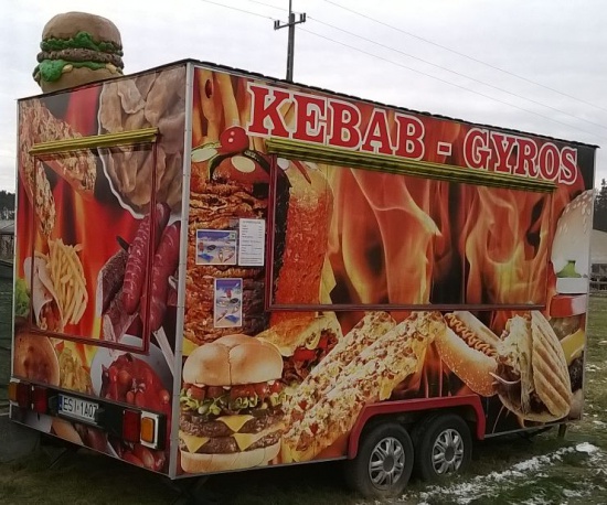 Wyposażenie przyczepy stanowią nowe meble tj. lady, szafki, półki oraz szafa ubraniowa dwuczęściowa dla obsługi, ponadto: okap z boksem z blachy kwasoodpornej, zlewozmywak jednokomorowy i umywalka do mycia rąk - zgodnie z wymogami sanepidu oraz przepływowy podgrzewacz wody, 2 opiekacze do kebaba, piecyk elektryczny do zapiekanek, 3 mikrofalówki, frytkownica dwukomorowa, bemar, grill kontaktowy, witryna chłodnicza sałatkowa, chłodziarka do napojów, lodówka, 2 zamrażarki, 2 okna sprzedażowe. Przyczepa sklep/bar posiada aktualną pozytywną decyzję sanepidu, przegląd oraz ubezpieczenie.