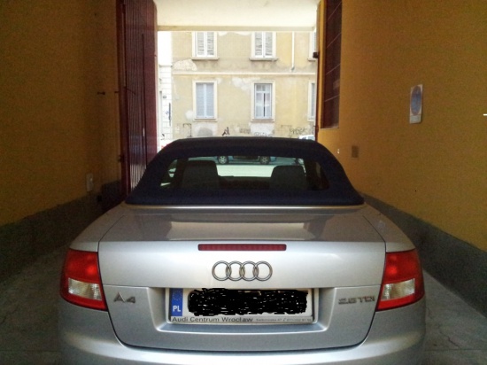 Audi A4 Cabrio, 2.5 TDI, z 2004 roku. Przej.185.000km.Srebrny metalik, tapicerka welurowa. Klimatyzacja automatyczna, radio+CD, poduszki powietrzne, komputer pokladowy, el.lusterka, ogrzewana przednia szyba, elektrycznie otwierany dach, immobiliser. Drugi wlasciciel, garazowany, ksiazka serwisowa.
