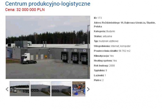 Centrum logistyczno- dystrybucyjne w Dąbrowie Górniczej z magazynem o powierzchni 16 000 m2 i halą produkcyjną o pow 2500 m2 w Dąbrowie Górniczej. Magazyn klasy A, w pełni wyposażony we wszystkie urządzenia i instalacje niezbędne do funkcjonowania nowoczesnego centrum dystrybucyjnego. Wyposażenie centrum logistycznego: regały, systemu podajników, 3 poziomowa antresola, urządzenia i automatyka do produkcji opakowań, automatycznego pakowania produktów, terminale RF, kilka rodzajów wózków widłowych. Obiekt posiada także budynki biurowe w pełni wyposażone, o funkcjonalnym rozkładzie umożliwiającym sprawne zarządzanie oraz nadzór nad działalnością obiektu. Teren wokół centrum dystrybucyjnego został dostosowany do profilu działalności centrum, a organizacja przestrzeni wokół obiektu zapewnia dodatkową powierzchnię składowania oraz magazynowania.