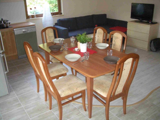 Domek 1 całoroczny (6-8os.) - 3 sypialnie 2osobowe z łazienkami, salon z aneksem kuchennym i kominkiem. W salonie rozkładana kanapa, telewizor, na korytarzu łazienka. Kuchnia w pełni wyposażona- kuchenka, lodówka,, zmywarka oraz naczynia. Przed domkiem bardzo duży zadaszony taras.