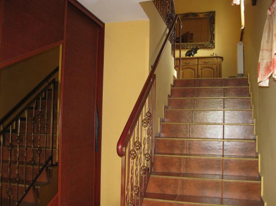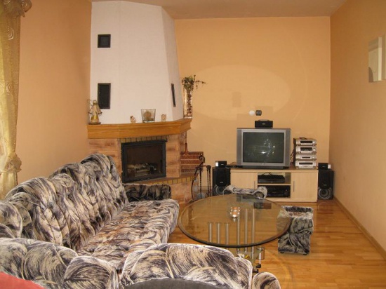 Na piętrze mieszkanie o wysokim standardzie: 3 pokoje (około 25m, 14m, 9m), w tym 1 pokój z aneksem kuchennym 13m, z wyjściem na balkon, z kominkiem, sypialnia i pokoik z szafą 3 drzwiową typu komandor, duża łazienka z wanną narożną,, przedpokój.