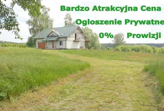 Nowy Domek (ok. 202 netto, użytkowa ok. 140m2) posiada duży salon z kuchnią i łazienką na parterze, połączony z dużym dwustanowiskowym garażem posiadającym kanał z nowoczesną, bardzo cichą bramą firmy Hormann na pilota oraz 4 pokoje z łazienką na użytkowym poddaszu. Dom jest w stanie surowym zamkniętym(czyli możliwość aranżacji, wystroju, itd. może być po stronie nowego właściciela) jest postawiony na małym wzgórzu, z którego rozpościera się przez wielkie tarasowe podwójne okna przepiękny widok na okoliczne pola, łąki, lasy pełne grzybów i jagód po których przemieszczają się sarny, jelenie, łosie, liski. Na pobliskim słupie energetycznym co roku przylatują Bociany a na lęgowiska, tereny lekko podmokłe Żurawie. Domek zbudowany jest z bardzo dobrych materiałów, czyli bloczków silikatowych, poddasze ocieplone podwójnie wełną mineralną oraz zabezpieczone folią paraizolacyjną. Dach pokryty jest zieloną blachodachówką Ruukki, kominy z cegły klinkierowej w lekkim kolorze żółtego. Okna plastykowe w kolorze złoty dąb o bardzo dobrej jakości na parterze jak i poddaszu. Okna i drzwi tarasowe oraz okna połaciowe w każdym z pokoi na poddaszu. W domu jest też kominek ok. 14kw. Do domu kablem ziemnym doprowadzony jest prąd 220-240V plus siła ok 400V i specjalny przełącznik na własny generator prądu. Z własnej studni głębinowej doprowadzony jest plastykowy bardzo trwały wąż do wody.