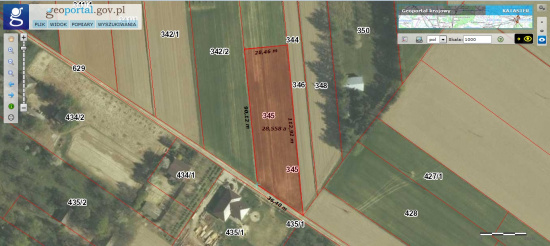 Wymiary działki są w kształcie trapezu z wytyczoną granicą. Wymiary działki w kształcie prostokąta to ok: 28,5m x 90 m.