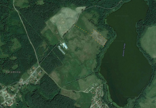 Na sprzedaż działka na Mazurach nad jeziorem Tuchel, pow. Kętrzyn, wieś Kwiedzina – z wykupionym obszarem na drogę. Teren o powierzchni 1,27ha ( 12700 m2 ) z linią brzegową długości około 70m.