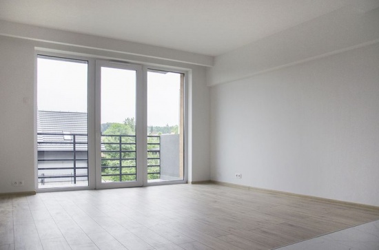 Jeden pokój z dużym oknem balkonowym, miejsce na otwartą kuchnię oraz przestronna łazienka.
