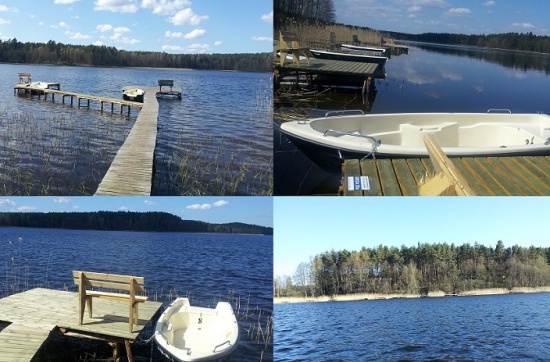 - Pomost do dyspozycji gości dwóch domków, położony 50 m od domku, przy którym umocowana jest łódka. Na pomoście znajduję się drewniana ławka.