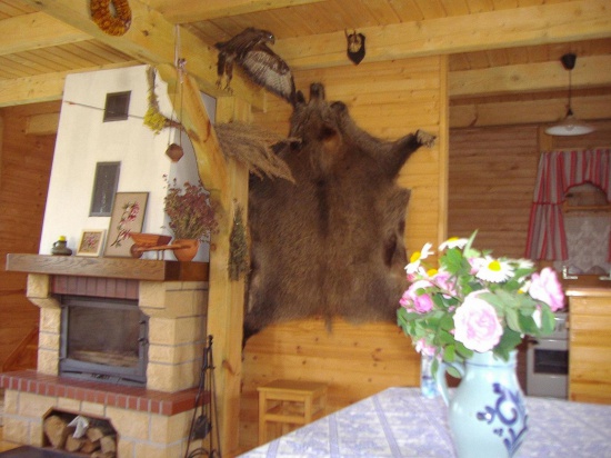 Domek wygodny, calkowicie wykonany z drewna. Na parterze izba z kominkiem, aneksem kuchennym i lazienka. Na pietrze hall wypoczynkowy i 3 sypialnie, kazda z 2 miejscami do spania. Lacznie ok 100 mkw powierzchni. Na zewnatrz murowany grill, do dyspozycji gosci 2-osobowa lodka. Zezwolenia wedkarskie do kupienia na miejscu.