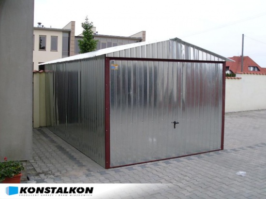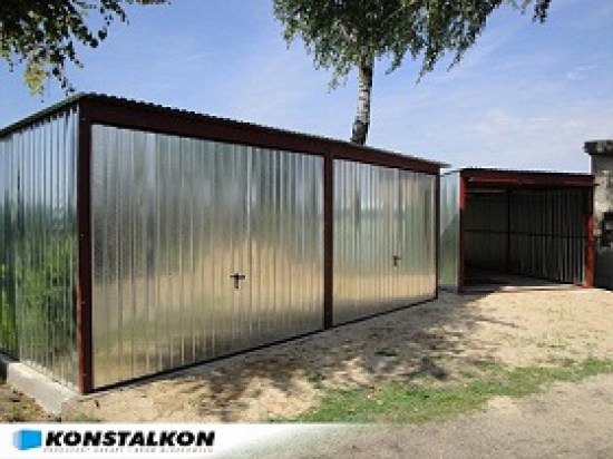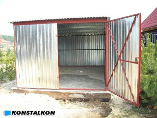 Garaże blaszane wykonane są z konstrukcji z kątownika zimnogiętego pomalowanego farbą podkładową. Do konstrukcji nitowana jest blacha trapezowa,ocynkowana w I gat. Trapez na dachu T14 a na ścianach T7. W standardzie jest brama dwuskrzydłowa na boki otwierana z zamkiem pośrodku oraz uszy na kłódki góra i dół. Spad dachu do tyłu.