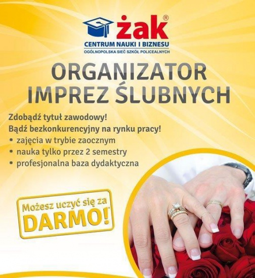 Organizator imprez ślubnych w szkole ŻAK – zaoczny system nauczania z pisemną gwarancją braku ukrytych kosztów! Nie wymagamy matury! Zapisz się już dziś i odbierz dyplom za 10 miesięcy!