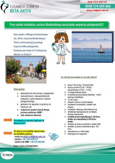 Dom opieki z Villingen-Schwenningen (ok. 30 km od jeziora Bodeńskiego i 70 km od Konstancji) poszukuje wsparcia kilku pielęgniarek.