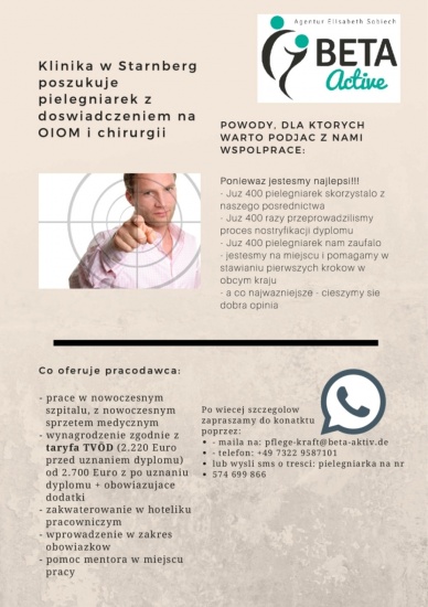 Klinika w Starnberg poszukuje pielęgniarek z doświadczeniem na OIOM i chirurgii