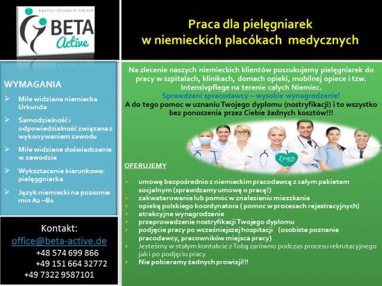 Kontakt: Beta-active Elisabeth Sobiech (skorzystaj z formularza) +49 151 66432772 574 699 866 https://www.beta-active.de/praca