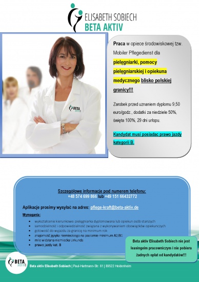 Praca w opiece środowiskowej tzw. Mobiler Pflegedienst dla pielęgniarki, pomocy pielęgniarskiej i opiekuna medycznego blisko polskiej granicy!!!