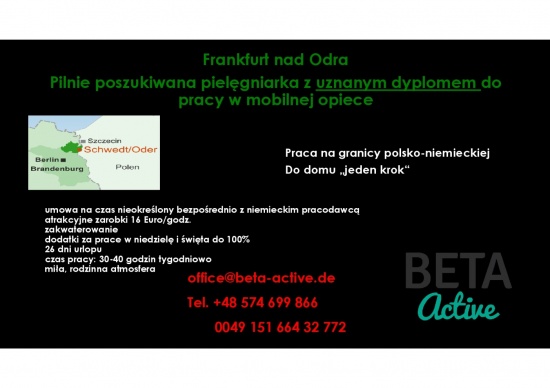 Pilnie poszukiwana pielęgniarka z uznanym dyplomem do pracy w mobilnej opiece.