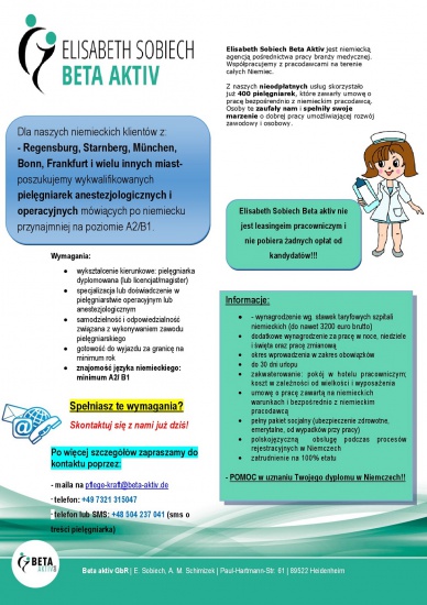 Elisabeth Sobiech Beta aktiv nie jest leasingeim pracowniczym i nie pobiera żadnych opłat od kandydatów!!!