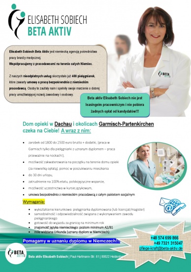 - zarobek od 1800 do 2500 euro brutto + dodatki, (praca w Garmisch tylko dla pielęgniarki z uznanym dyplomem – praca przeważnie na nockach!),