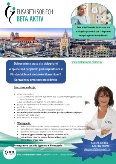 Dobrze płatna praca dla pielęgniarki w opiece nad pacjentem pod respiratorem w Fürstenfeldbruck niedaleko Monachium!!!. Sprawdzony przez nas pracodawca.