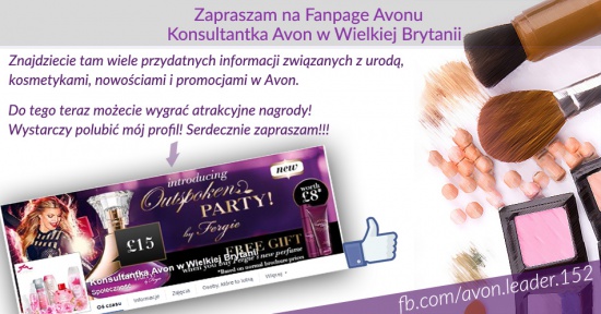 Jeśli potrzebujesz więcej informacji na temat Avonu, kosmetyków lub informacji - jak zostać konsultantem lub liderem, napisz lub wejdź na stronę www.konsultantkauk.co.uk i dowiedz się szczegółów !!!!!! Odpowiem na każde Twoje pytanie!!!!!