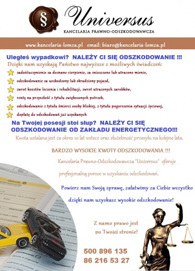 Jesteśmy ogólnopolską KANCELARIĄ PRAWNO-ODSZKODOWAWCZĄ z siedzibąw ŁOMŻY.