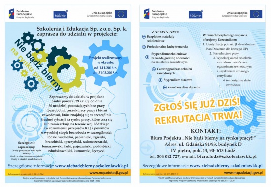 Zapraszamy do udziału w projektach: "Nowy zawód - nowy start!", "Nie bądź bierny na rynku pracy!" i "Nowe Perspektywy w woj. łódzkim!"