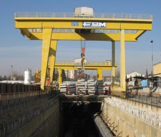1) Suwnica bramowa z podwójnym wózkiem. Marka: FOM Spa Mod. GCB2A 6000 . Rozstaw 5000 + 13000 + 5000 mm. Udźwig: 300 + 300 KN = 60 Ton.