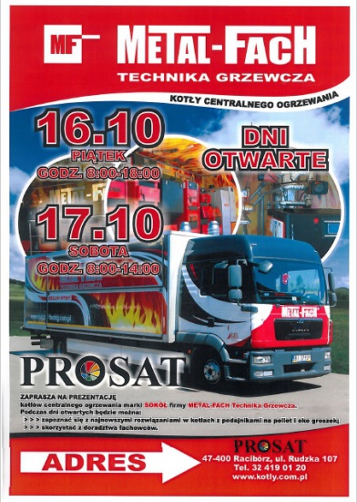 Firma PROSAT w Raciborzu zaprasza na dni otwarte renomowanej firmy Metal- Fach, reprezentującej branżę techniki grzewczej. Dni te odbędą się 16 i 17 października na parkingu firmy PROSAT w Raciborzu na ulicy Rudzkiej 107. Godziny otwarcia: piątek od 8-18, sobota od od 8-14. Firma znajduje się przy drodze wojewódzkiej nr 919: Gliwice-Racibórz, czyli na wyjeździe z Raciborza na Rudy. Przy firmie jest duży parking.