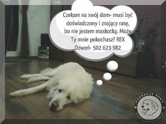 Rex jest młodym, około 2-letnim psem w typie rasy Owczarek Podhalański. Trafił do schroniska dla zwierząt po śmierci swojej pierwszej opiekunki, a ze schroniska zabraliśmy go do domu tymczasowego Fundacji BONO, gdzie obecnie przebywa. Jest zdrowy, zaszczepiony, wykastrowany.