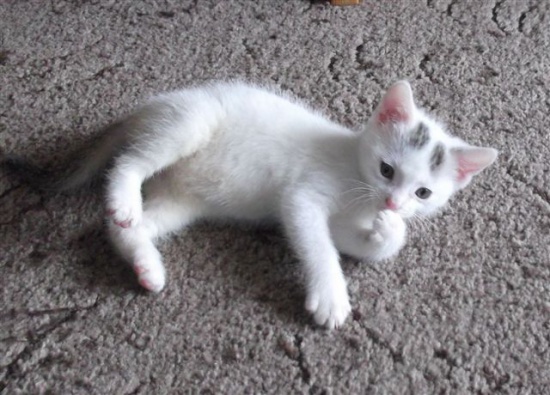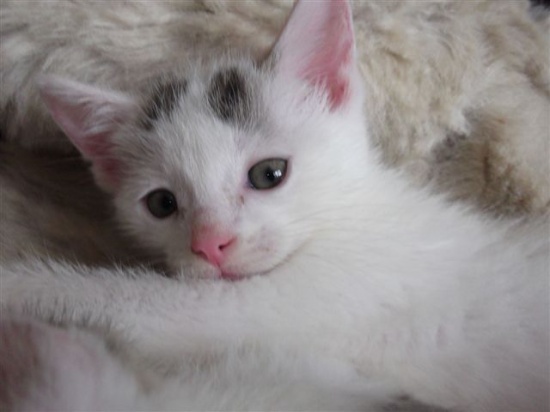 Żabolek Ropuszek - były sobie trzy maleńkie kocięta znalezione bez matki, wykarmione smoczkiem. Trzy maleńkie Żabolki. Wyrosły piękne i przemiłe, pełne zaufania do ludzi, bo to ludzie wykarmili. Dwa znalazły już swoje domy, a trzeci, śliczny bielutki jak mleko, z ciemnym ogonkiem i czapeczką, z różowiutkim całuśnym noskiem szuka swojego miejsca - być może w Twoim sercu je znajdzie. Urodził się końcu maja 2014, jest zaszczepiony i odrobaczony, ma książeczkę zdrowia.