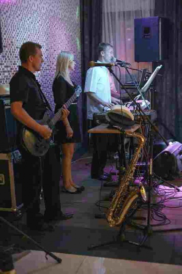 Wokalistka, 3 wokalistów Bardzo szeroki repertuar,saksofon,akordeon gitary, klawisze, profesjonalne nagłośnienie i oświetlenie, biesiada przy stołach - przy akompaniamencie i śpiewie, wyprowadzenia u Młodych, liczne zabawy i konkursy, również KARAOKE. Płyty DVD i CD do wglądu.