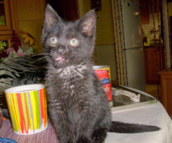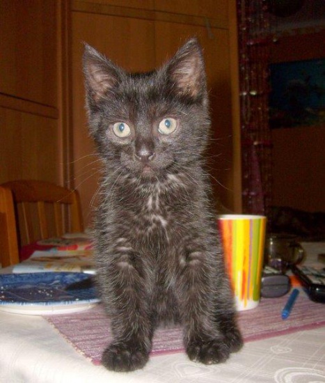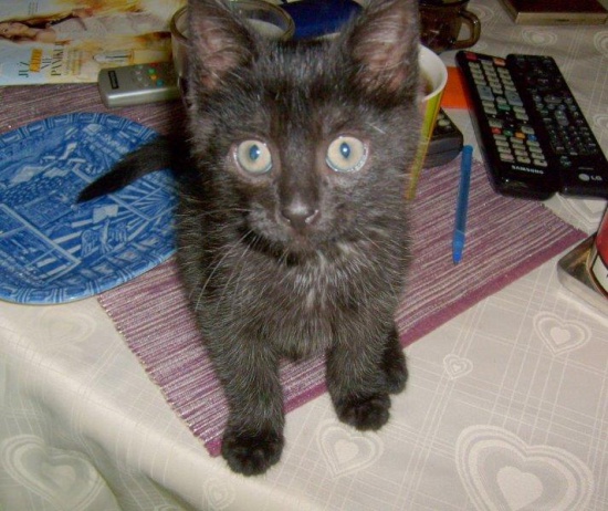 Czarny Kominiarczyk - malutki domowy kociak wyciągnięty z komina. Uciekł i wpadł? Ktoś się w ten sposób malcem bawił? Głośnym krzykiem wezwał pomoc, z wielkim trudem udało się w go wyciągnąć. I bardzo prosi o dom - odpowiedzialny i kochający. Jest bardzo komunikatywny i ma wyjątkową osobowość, szuka czułego kontaktu z człowiekiem, uwielbia spać na rękach. Urodził się w końcu kwietnia 2014, jest odrobaczony i zaszczepiony.
