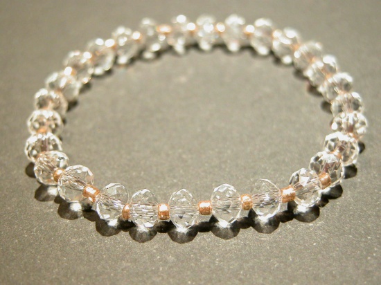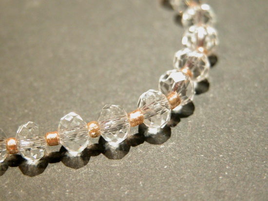Bransoletka wykonana z kryształków fasetowanych Swarovski Briolette Cristal w towarzystwie złotych koralików Toho. Bransoletka posiada zawieszkę w postaci kryształka z karabińczykiem.