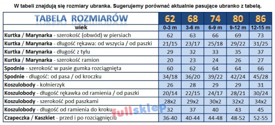 2) - Naszym klientom dajemy możliwość dobierania różnych rozmiarów części na przykład: strój wybiorą Państwo w rozm. 86 cm a kurtkę 80.