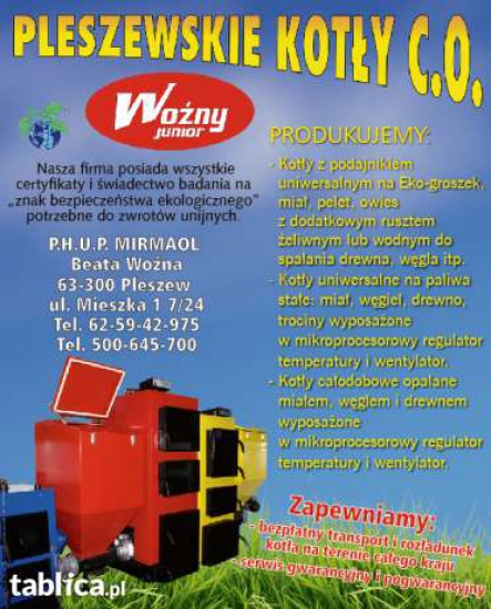 Zakład Produkcji kotłów P.H.U.P. MIRMAOL Beata Wozna 63-300 Pleszew ul. Mieszka 1 7/24 zaprasza państwa do zapoznania się z naszą ofertą. Produkujemy osiem typów kotłów od 5kW do 560kW