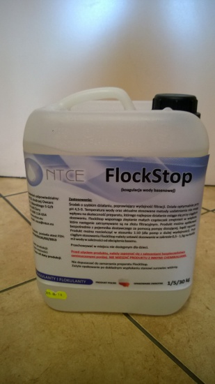 Koagulant Flockstop- Wysoko skoncentrowany, płynny środek do koagulacji wody basenowej, zawierający chlorek wodorotlenku glinu. Posiada atest PZH. Jest to wysoko wydajny środek stosowany do klarowania wody basenowej oraz do koagulacji zanieczyszczeń w wodzie. Skutecznie wspomaga układ filtracji obiegu basenowego usuwając zmętnienie wody poprzez zbijanie drobnych zanieczyszczeń w większe, które następnie wyłapywane są przez złoże filtra basenowego.