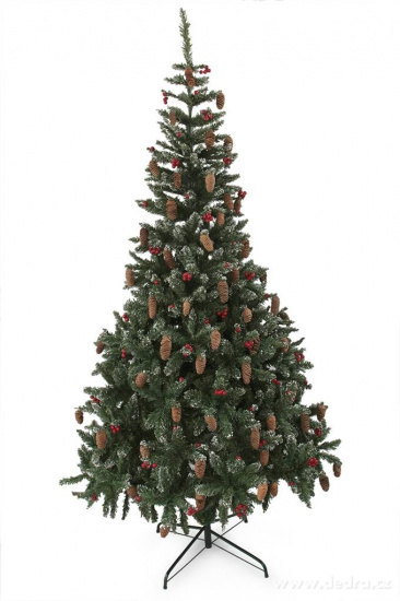 Zielony świerk wzbogacony o dekoracje - szyszki i owoce.Drzewko można ozdobić wedle uznania.Nie traci igieł, łatwo je zmontować dzięki elastycznym gałązkom.Białe końce gałązek sprawiają wrażenie leżącego na nich śniegu.