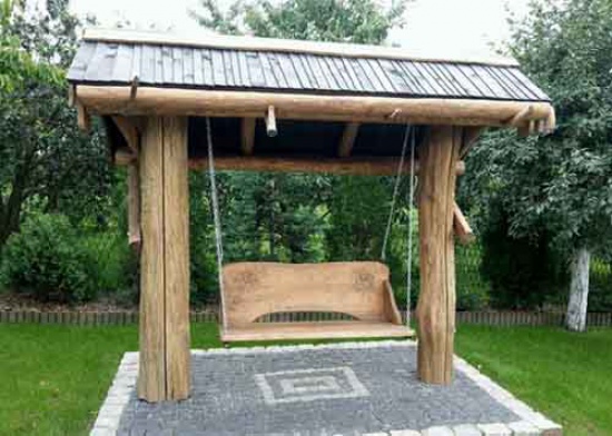 Witam, w sprzedaży rustykalna huśtawka ogrodowa. Oryginalna, wykonana w całości ręcznie z litego drewna, kryta gontem łupanych. Słupy i ławeczka rzeźbione, motyw mogą wybrać Państwo sami. Na zamówienie wykonamy huśtawkę o dowolnych wymiarach.