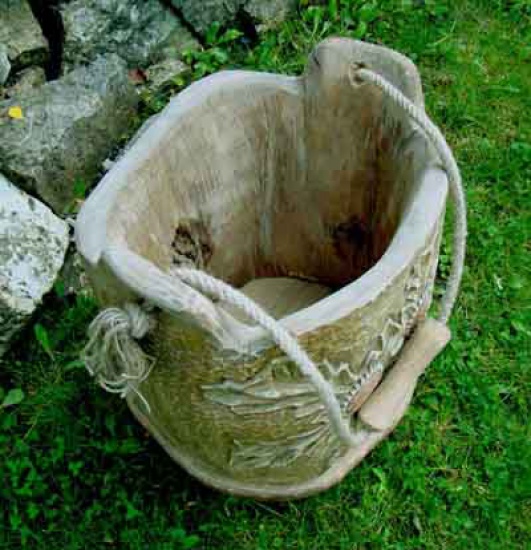 Niepowtarzalny kwietnik - wiadro, wydrążony z pnia lipowego, ręcznie rzeźbiony, bejcowany i lakierowany. Doda uroku każdemu wnętrzu, sprawdzi się również jako pojemnik na drewno kominkowe.