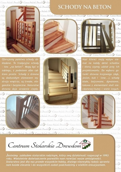 Schody mogą być samonośne lub na obłożenie schodów betonowych. Wykonane z drewna litego np: dębowego, jesionowego czy bukowego.