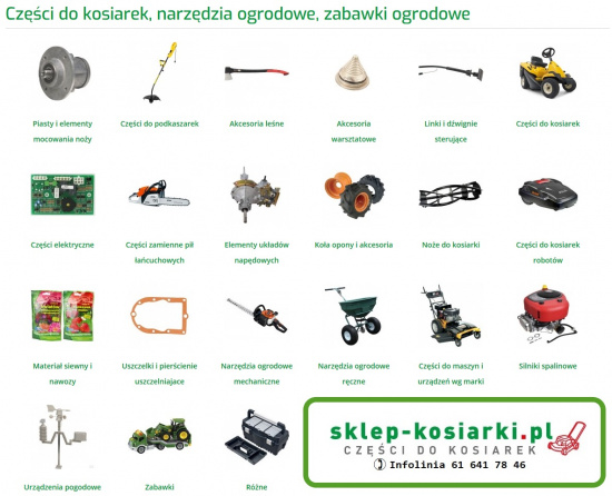Sklep-Kosiarki.pl oferuje szeroki asortyment oryginalnych części zamiennych do wszelkiego rodzaju kosiarek spalinowych i elektrycznych, kosiarek robotów, oraz traktorów koszących i kos spalinowych do trawy. Ponadto w naszym sklepie, akcesoria leśne, narzędzia ogrodowe i urządzenia pogodowe. Wieloletnie doświadczenie i bogata oferta części zamiennych to gwarancja najlepszego doboru asortymentu, dobrej ceny oraz szybkiej realizacji zamówienia.