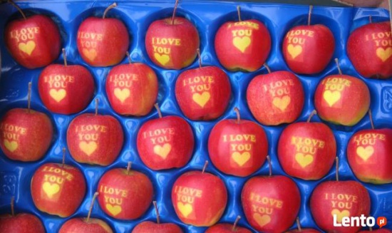Sprzedam jabłka z napisem I LOVE YOU z serduszkiem. Jabłka są pięknie wybarwione. Napis powstał podczas naturalnego oddziaływania słońca na naklejkę. Jabłka są doskonałym prezentem na Walentynki oraz Dzień Kobiet. Odmiana do sprzedania - Jonagored,.
