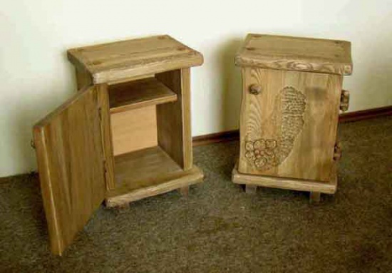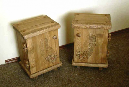 Stylowe, ręcznie rzeźbione szafki nocne, wykonane z litego drewna. Szafki zostały wykonane ręcznie, zdobione rzeźbionym ornamentem roślinnym, barwione i woskowane. Posiadają oryginalne drewniane zawiasy.
