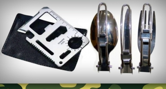 Zestaw podróżnika - niezastąpiony podczas każdej wyprawy: sztućce składane i wielofunkcyjna metalowa karta survivalowa za 27 zł
