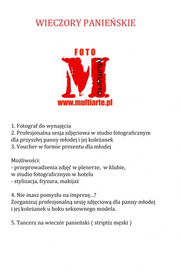 Wieczór panieński...a Ty nie masz pomysłu? Dla Ciebie czeka fotograf do wynajęcia lub profesjonalna sesja zdjęciowa w studio fotograficznym dla przyszłej panny młodej. Voucher w formie prezentu dla młodej to wspaniała pamiątka na całe życie. Więcej informacji tel.604-190-272 e-mail (skorzystaj z formularza)