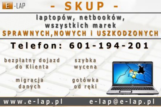 Firma E-lap z Wałbrzycha skupuje wszystkie marki laptopów, stan laptopa bez znaczenia, kupujemy również laptopy uszkodzone. Zapewniamy odzyskanie i migrację danych, możliwa jest u nas wstępna wycena on-line na naszej stronie internetowej www.e-lap.pl , odbieramy sprzęt własnym transportem, tak więc nie ruszając się z fotela możesz sprzedać nam swój zbędny laptop. Zadzwoń i przekonaj się jakie to łatwe tel. 601 194 201