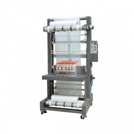 Zgrzewarka do pakowania butelek, słoików w zgrzewki foliowe. Do foliowarki należy podłączyć tunel obkurczający(który nie jest w zestawie). Na tackach lub luzem ustawiamy butelki na blacie. Następnie wciskamy guzik - tłok przesuwa butelki poza światło folii następnie od góry opada ramie zgrzewająco - odcinające. Następnie zgrzewki trafiają do tunelu obkurczającego, który obkurcza folię.